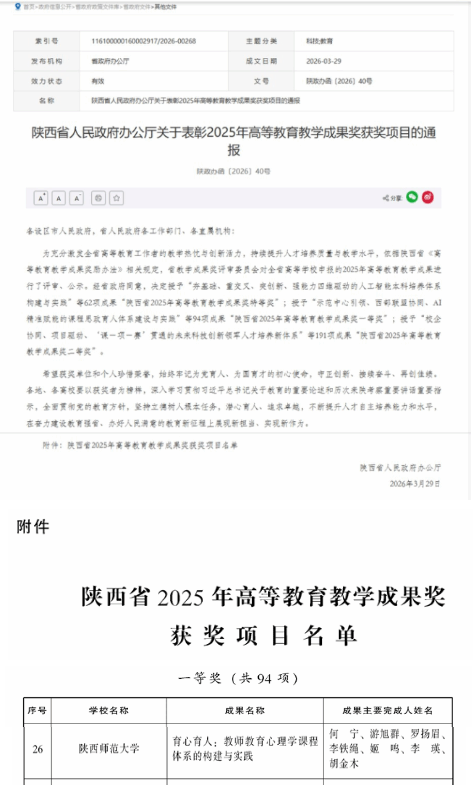 近日,陕西省人民政府办公厅发布《关于表彰2025年高等教育教学成果奖获奖项目的通报》(陕政办函〔2026〕40号),正式公布了陕西省2025年高等教育教学成果奖获奖项目名单。学院申报的《育心育人:教师教育心理学课程体系的构建与实践》本科教育教学成果获一等奖。