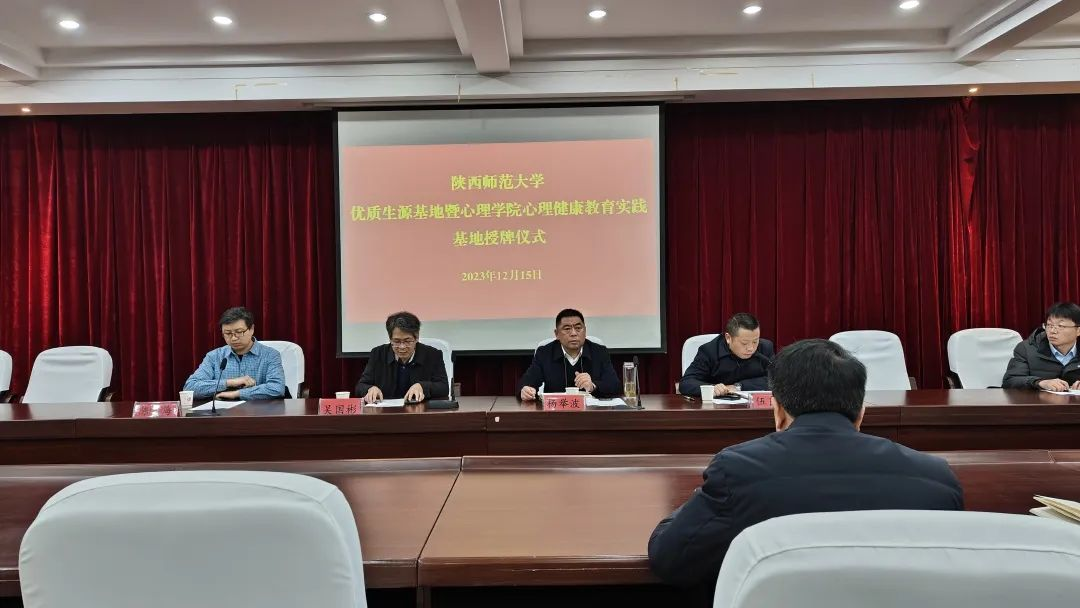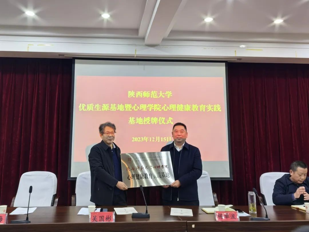 在签约、授牌仪式上,吴国彬书记与杨举波校长就优质生源基地合作签约,吴国彬作为代表授牌黔江中学“陕西师范大学优质生源基地”“陕西师范大学心理学院心理健康教育实践基地”。