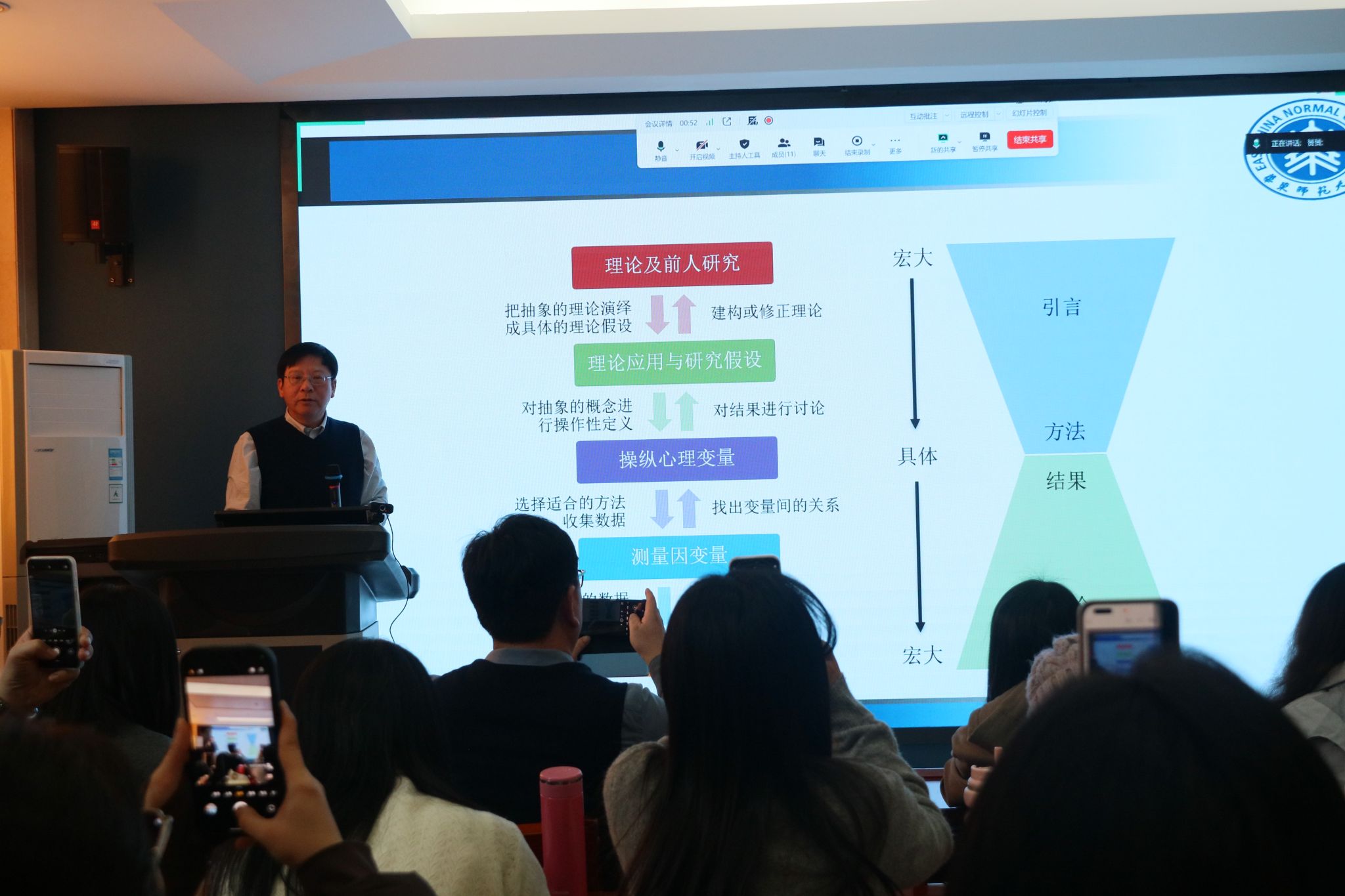最后,周教授还分析了学生在研究设计与写作中常遇到的困惑,如操作检验不足、时间变量忽略、过度依赖问卷、滥用中介模型等。他通过案例强调清晰图表、规范三线表与合理数字呈现的重要性,并指出科研在设计、实施与写作中必须保持逻辑一致。
